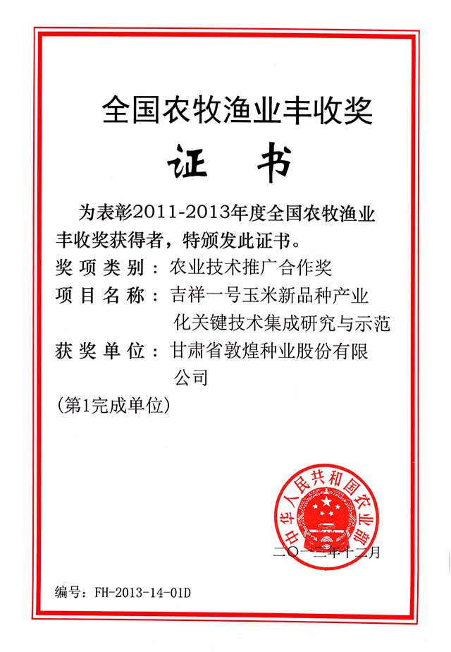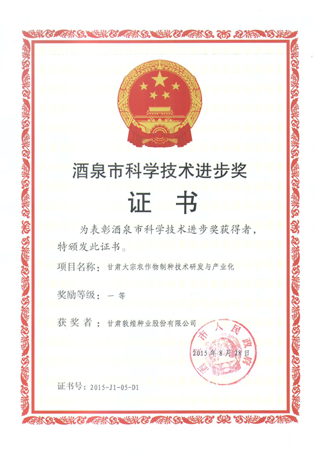 2015年甘肅省農(nóng)牧漁業(yè)豐收獎一等
